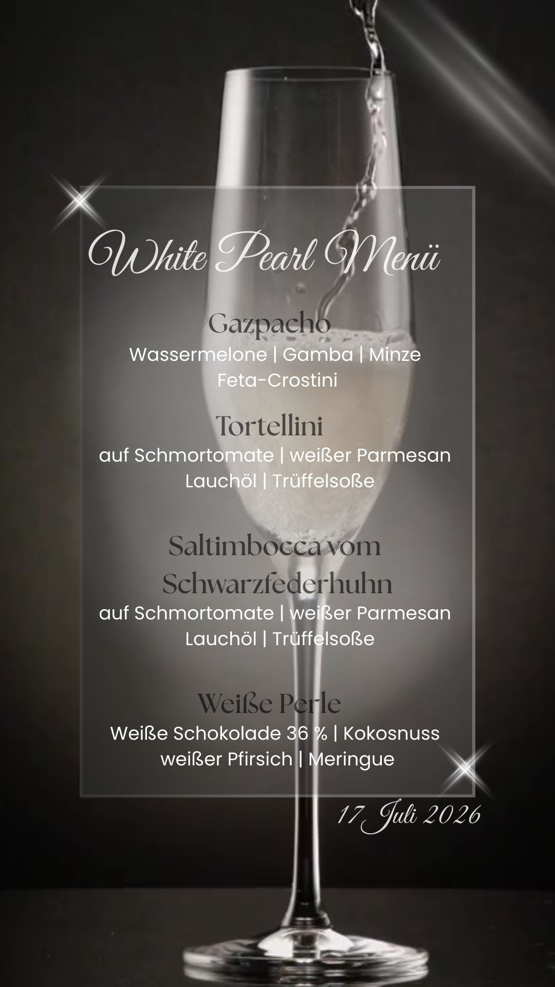 Ein Abend ganz in Weiß Am 17. Juli 2026 ab 19.00 Uhr- 1.00 Uhr laden wir Sie zur White Pearl Sommernacht 150€ pro Person all in |
